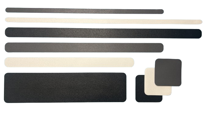 Die Antirutschoberfläche besteht aus einem geprägten EN71 niedrigtemperaturresistenten PVC Film. Die selbstklebende Rückseite ist mit einem extrem wasser- und schrumpfresistenten, drucksensiblen Polymerklebstoff und einer Abziehfolie zum Schutz der Klebstoffschicht.